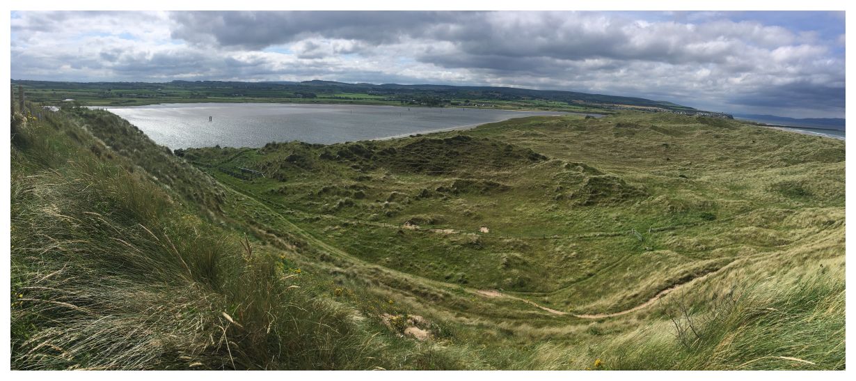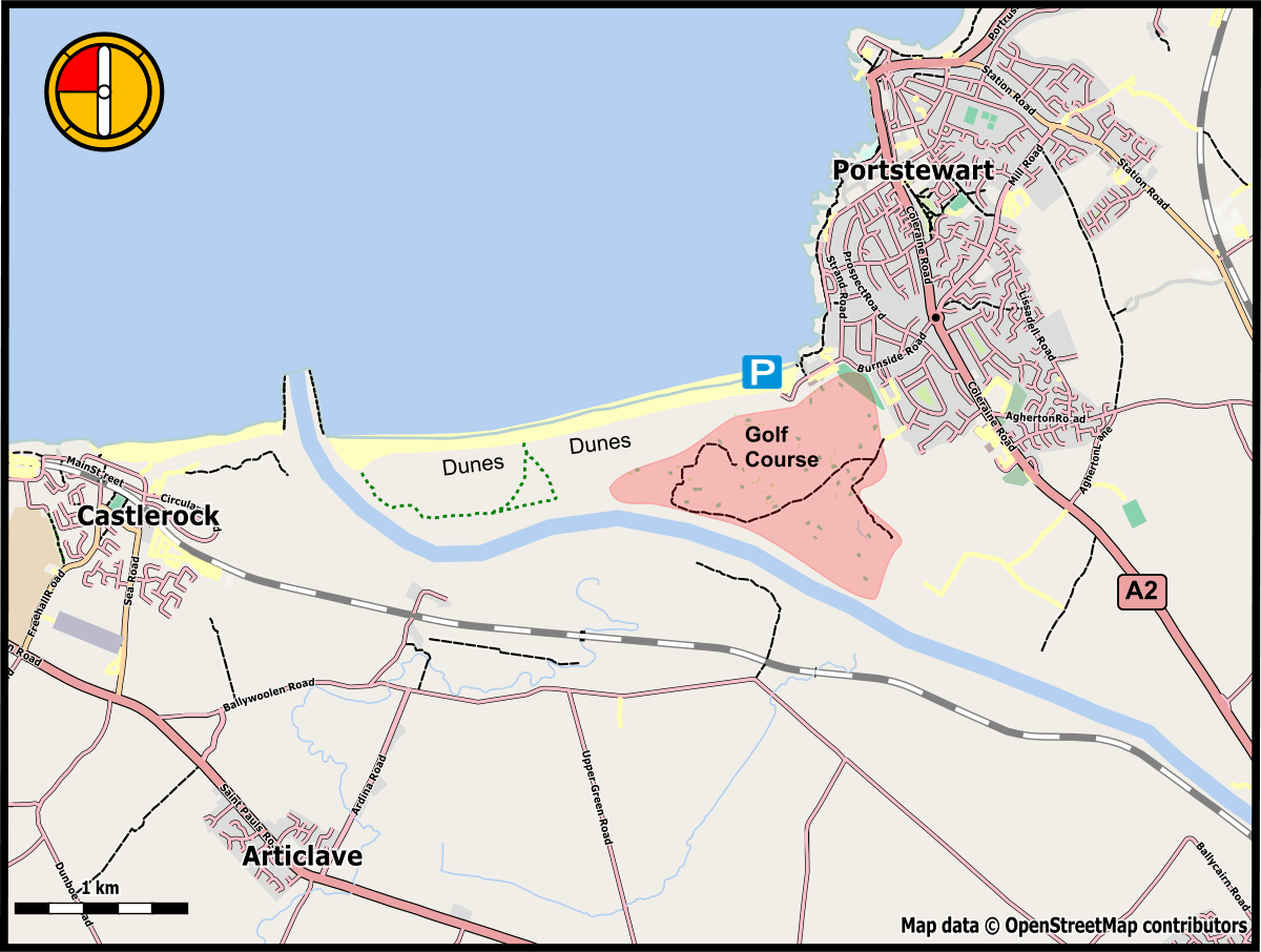 Portstewart is classic sand dunes Orienteering terrain. The area is unusual in that it is bounded by the sea to the north and by the River Bann to the south and west. In recent years large amounts of thorny scrub have been removed by the National Trust. This has increased runability and opened up new sections of terrain. The easterly section, near the start, has many small informal paths and while the map has been updated to show the principal ones, not all are mapped. The mid and west sections, in contrast, have very few paths and the contour detail here is particularly complex. There are a number of fences in these areas and the marked gate crossings must be used.