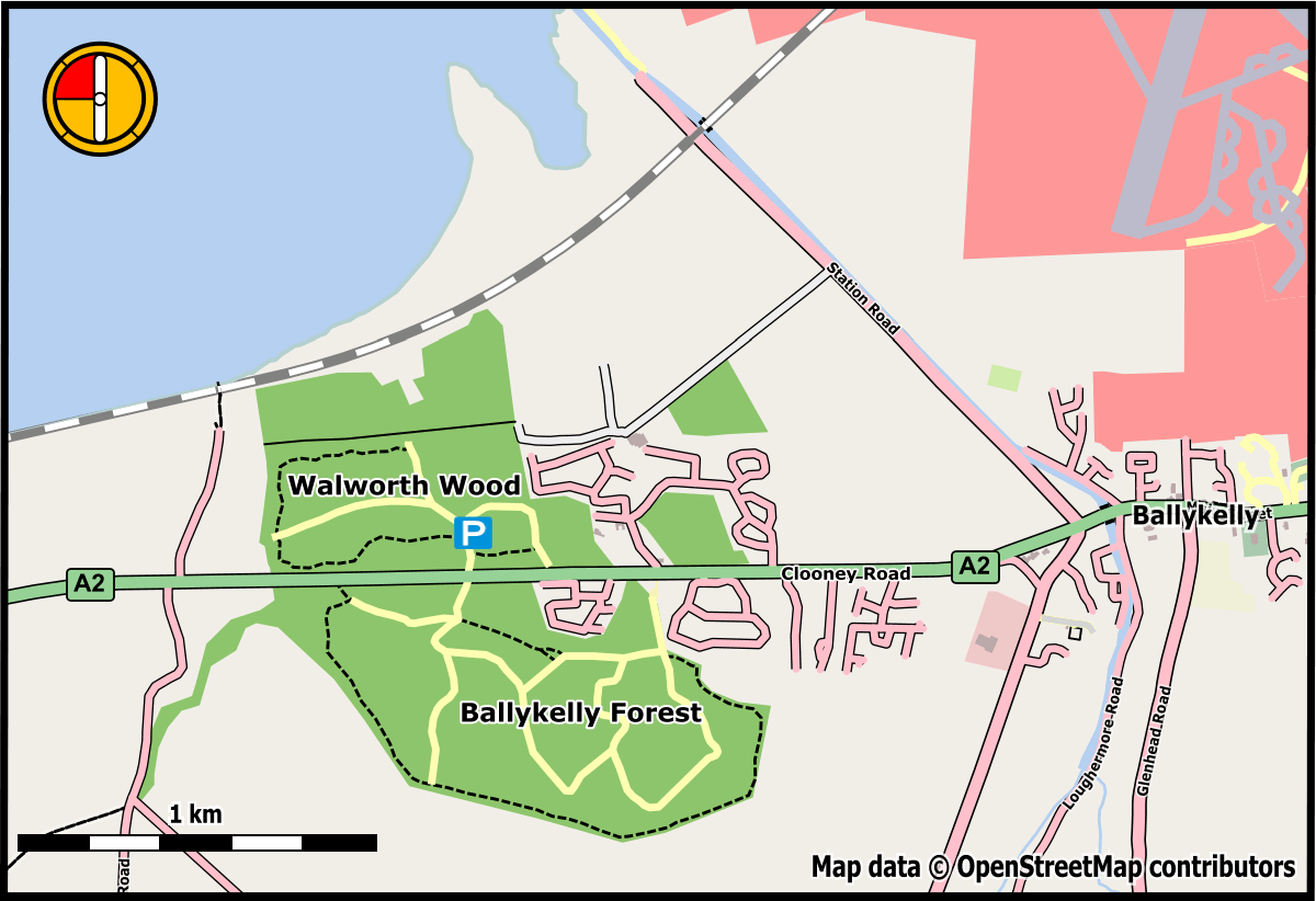 This is the northern section of Ballykelly Forest, the first state forest to be acquired in Northern Ireland. Four and a half hectares of Douglas Fir were planted here in 1912 within the boundaries of a much more ancient woodland. While today the Wood is mainly made up of conifer plantation, around the edges snippets of the old natural woodland remain. This Orienteering map uses the townland name Walworth to distinguish this forest from the main part of Ballykelly Forest on the south side of the A2 road.