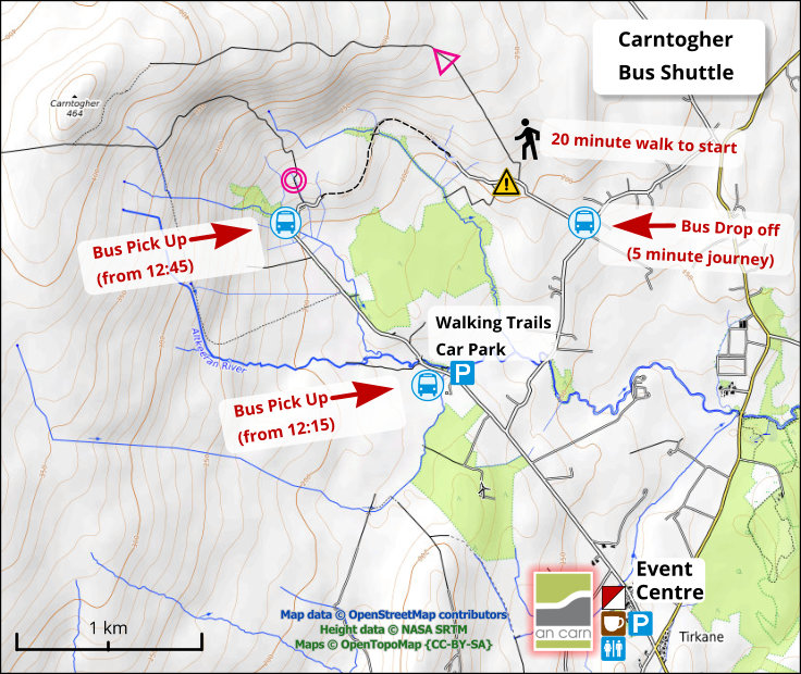 A shuttle bus will take competitors to the start. This will leave adjacent to event enquiries. It will take 10 minutes to drive to the drop-off. There is then a further 20 minute uphill walk to the start.
