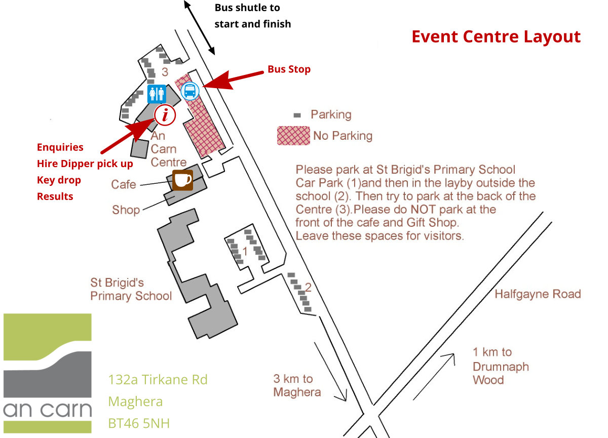 Enquiries, hire dipper pick up and car key drop will be at the An Carn Centre.