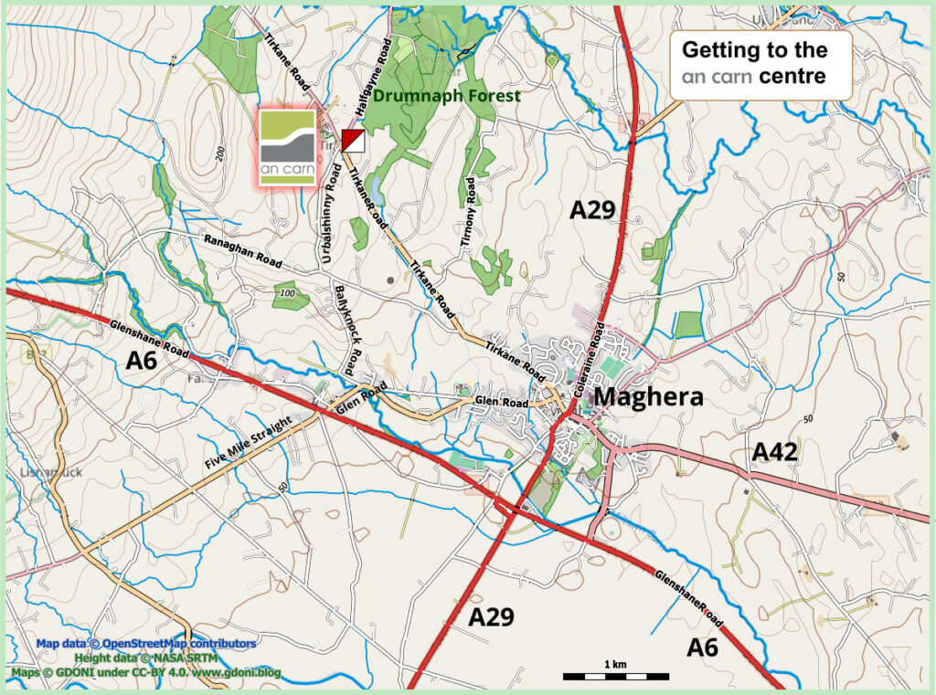 Parking will be at the An Carn Community Centre and Cafe. Please do not park directly in front of the centre (this is reserved for normal customers) and use the three areas shown on the map below.